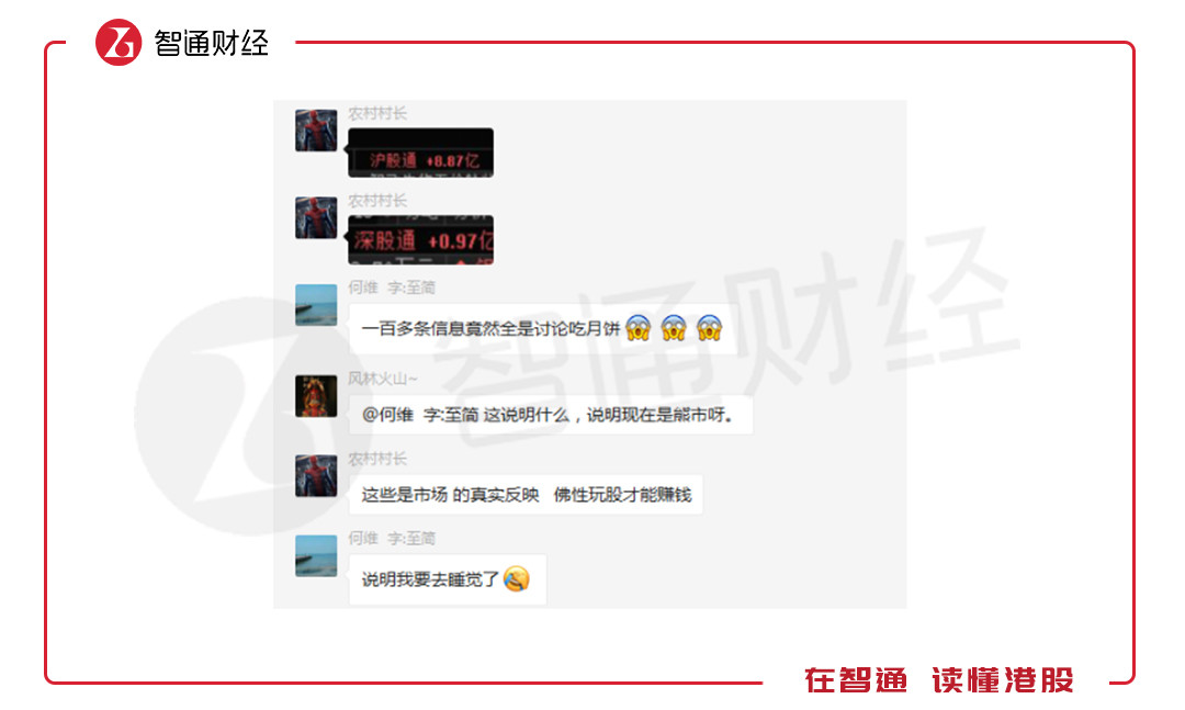 被黑天鵝痛擊一番后,市場(chǎng)悲觀情緒明顯占據(jù)了上風(fēng)。智通財(cái)經(jīng)APP觀察到,某500人的投資大群雖活躍度照常,但全變成了說“新財(cái)富風(fēng)月”、“品月餅”,絲毫沒有往日的“談市場(chǎng)、擺數(shù)據(jù)、說動(dòng)向”,甚至不惜爭(zhēng)個(gè)臉紅耳赤的情形。