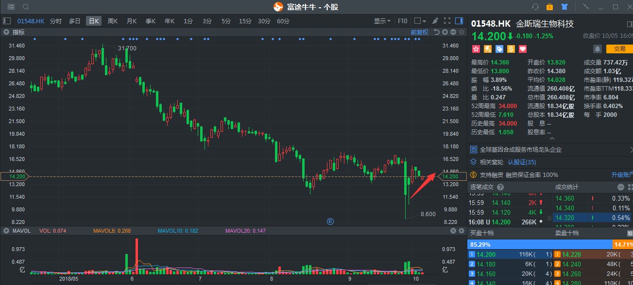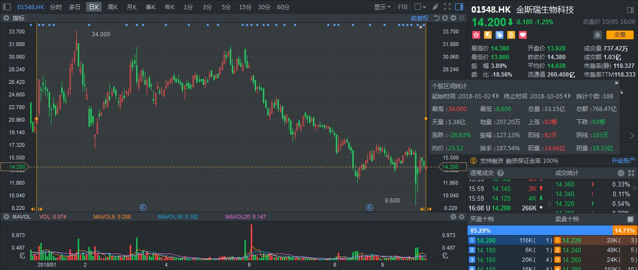 談及去年的港股牛市,金斯瑞應(yīng)該算得上是生物醫(yī)藥板塊中,非常引人注目的一只股票。就算2018年隨大市回調(diào),但表現(xiàn)仍可圈可點(diǎn):受益港股通北水資金利好,成交量異?;钴S,成交量平均每日達(dá)到2000萬股,總額平均4.08億港元。細(xì)數(shù)港股通標(biāo)的,有如此活躍成交量的股票確實(shí)不多。