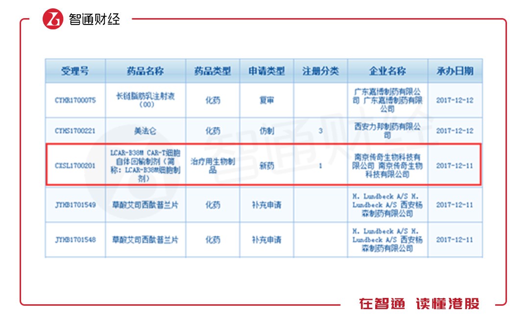 到2017年12月11日,傳奇生物提交CAR-T療法中國臨床申請(CXSL1700201)獲得CDE正式承辦受理,成為國內(nèi)首個獲得受理的CAR-T產(chǎn)品。同月18日,藥品評審中心公布第二十五批優(yōu)先審評審批名單,傳奇生物的LCAR-B38MCAR-T細(xì)胞自體回輸制劑獲準(zhǔn)進(jìn)入。2018年3月12日獲CFDA臨床審批完畢。