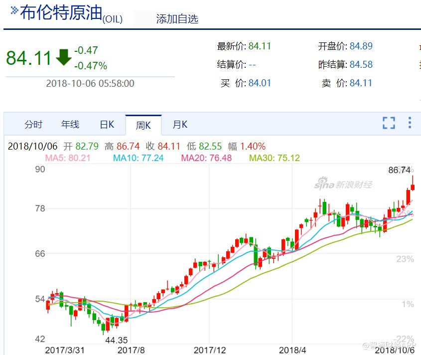 油價(jià)漲勢(shì)仍在持續(xù)。10月3日,布倫特原油盤中突破85美元/桶關(guān)口,創(chuàng)下近四年新高,這已是布倫特油價(jià)連續(xù)第5個(gè)季度上漲,是2007年初以來(lái)最長(zhǎng)的一個(gè)上漲周期。