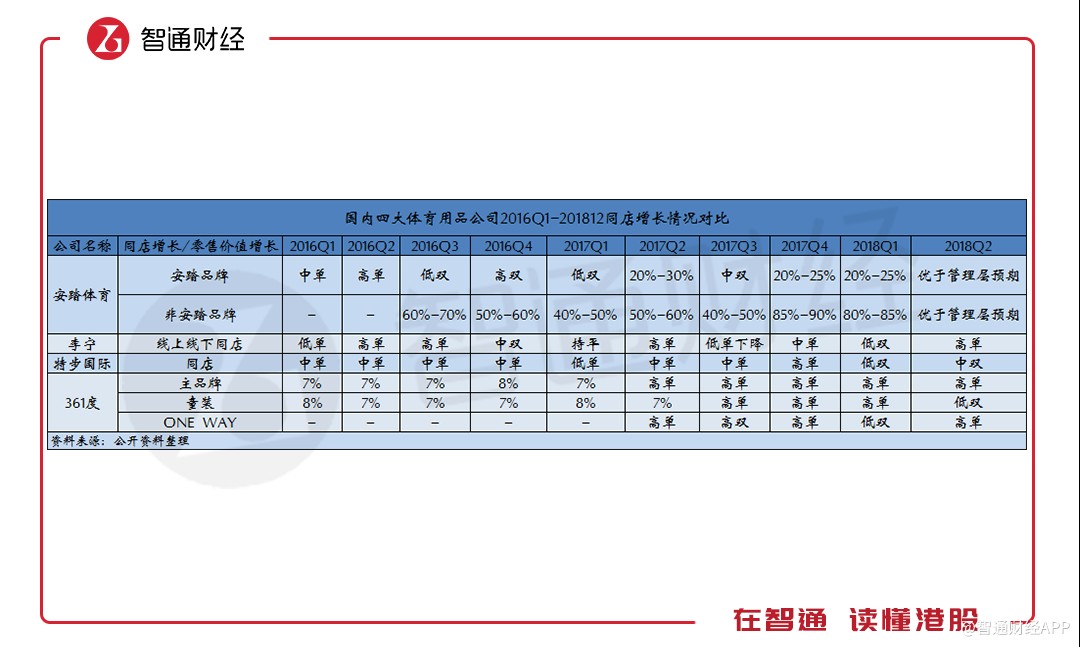 相較于安踏收購(gòu)Amer面臨未知數(shù),相較于李寧同店增長(zhǎng)數(shù)據(jù)不穩(wěn)定,相較于361度同店增長(zhǎng)還在單位數(shù)徘徊,特步已經(jīng)展現(xiàn)出脫穎而出的苗頭。