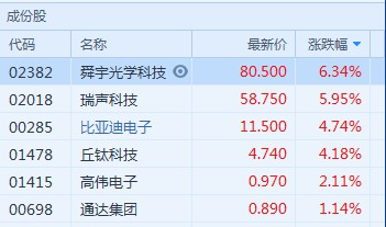受益于G20結(jié)果超預(yù)期,早盤手機(jī)產(chǎn)業(yè)鏈全線反彈。舜宇光學(xué)(02382)漲6.34%,報(bào)80.5港元,瑞聲科技(02018)漲5.95%,報(bào)58.75港元,比亞迪電子(00285)漲4.74%,報(bào)11.5港元。