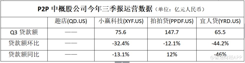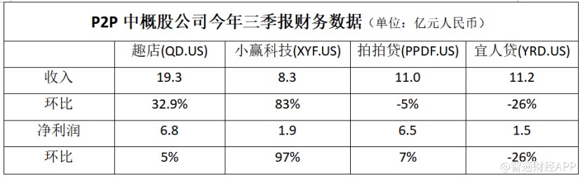 智通財經(jīng)APP觀察到,在披露三季報的P2P中概股公司中,趣店(QD.US)收入達(dá)19.3億元(人民幣,單位下同),環(huán)比增長32.9%,同期凈利潤為6.8億元,環(huán)比增長5%;小贏科技(XYF.US)收入為8.3億元,環(huán)比增加83%,凈利潤為1.9億元,環(huán)比增長97%;拍拍貸(PPDF.US)收入為11億元,環(huán)比下跌5%,凈利潤為6.5億元,環(huán)比增長7%;宜人貸(YRD.US)收入為11.2億元,環(huán)比下跌26%,凈利潤為1.5億元,環(huán)比下跌26%。
