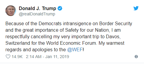 特朗普表示,由于民主黨在邊境安全問題上的頑固態(tài)度和國家安全的重要性,他謹(jǐn)慎地取消前往瑞士達(dá)沃斯參加世界經(jīng)濟(jì)論壇的行程,并向世界經(jīng)濟(jì)論壇致以問候和歉意。另外,美國政府高級官員表示,即使本月晚些時候政府仍處于關(guān)閉狀態(tài),美國財(cái)政部長姆努欽將帶領(lǐng)美國政府代表團(tuán)出席達(dá)沃斯論壇。