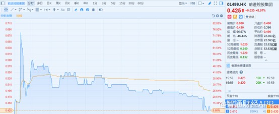 智通財(cái)經(jīng)APP獲悉,1月10日停牌的前進(jìn)控股集團(tuán)(01499)于24日復(fù)牌,股市反響劇烈,開盤十分鐘曾一度暴漲74.56%,不過隨后不斷滑落,截止16時(shí)45分,報(bào)港元0.425元(下同),較停牌日收盤價(jià)0.39元僅有9%的增幅。