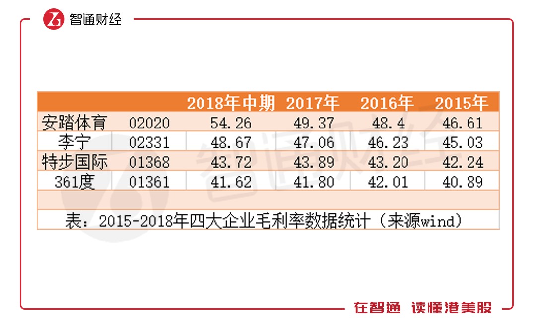 然而,高毛利優(yōu)勢(shì)并未在利潤(rùn)中體現(xiàn)。2015年時(shí),李寧的凈利潤(rùn)率為0.2%,2016年時(shí)上升至8.01%,2018年上半年時(shí),安踏、特步、361的凈利潤(rùn)率分別為18.54%、13.68%、11.26%,均遠(yuǎn)高于李寧的5.69%。