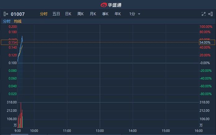 智通財經(jīng)APP獲悉,龍輝國際控股(01007)早盤受資金追捧,快速拉升,一度漲70%,截至9時38分,漲54%,報0.154港元,成交額達(dá)2218萬港元。