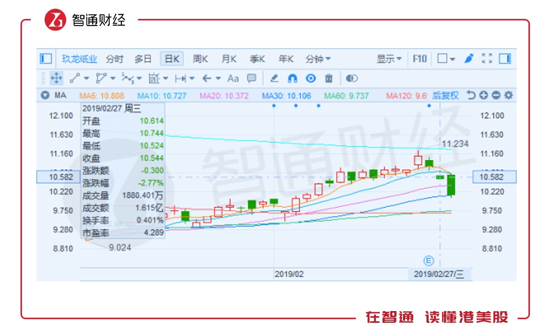 自周一港A股暴漲之后,玖龍紙業(yè)(02689)股價(jià)便已經(jīng)歷連續(xù)三天下跌。2月27日,公司召開(kāi)業(yè)績(jī)會(huì)當(dāng)天,公司股價(jià)收?qǐng)?bào)10.54,跌2.77%;28日續(xù)跌4.68%至8.14港元。