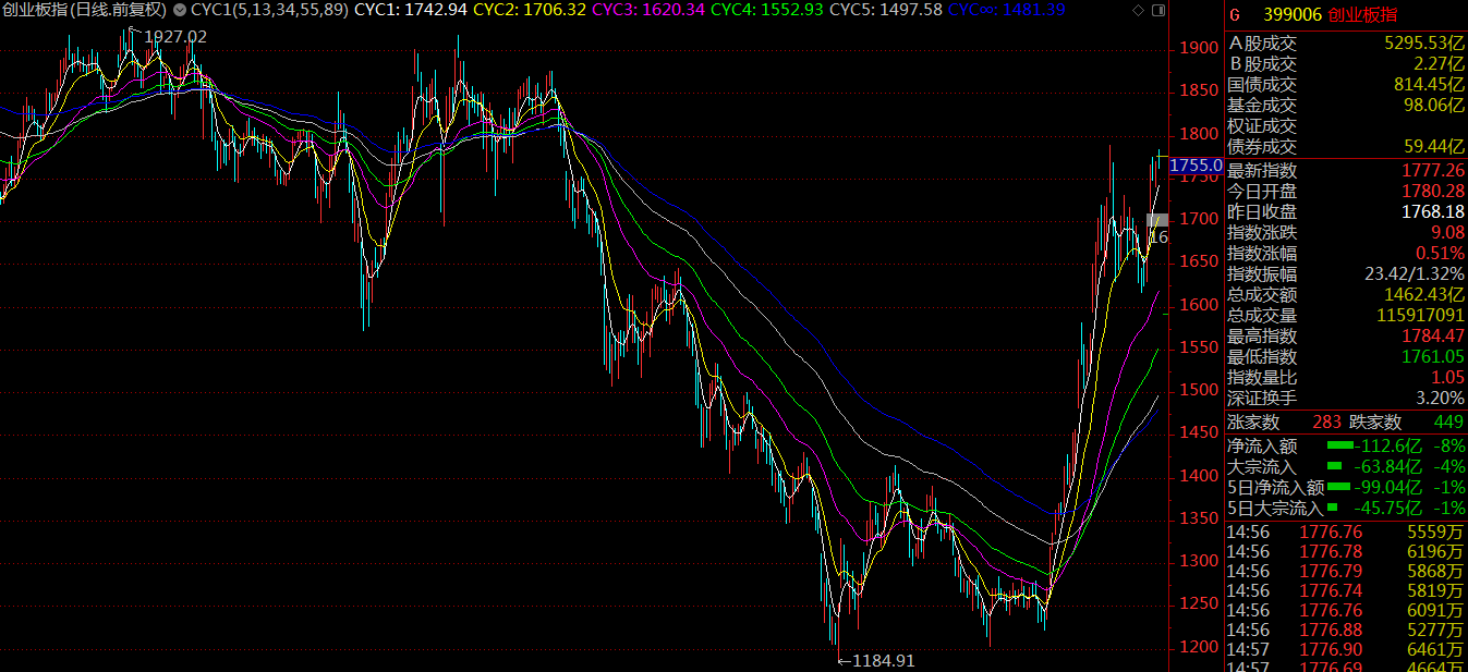 周一市場(chǎng)突破三月份的中樞結(jié)構(gòu),開啟了新一輪的上漲,市場(chǎng)情緒良好,基本維持了日均百股漲停的規(guī)模。至周四,滬指上漲5.04%報(bào)收3246.57點(diǎn),深成指漲5.14%報(bào)收10415.8點(diǎn),創(chuàng)業(yè)板漲4.94%報(bào)收1777.26點(diǎn)。值得留意的是,相較于第一波行情創(chuàng)業(yè)板指數(shù)大幅跑贏上證指數(shù)來(lái)說(shuō),這一次代表小盤股的創(chuàng)業(yè)板指數(shù)要弱于預(yù)期。
