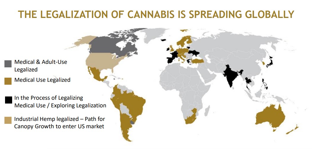 下圖是全球最大的工業(yè)大麻生產(chǎn)商CANOPY GROWTH披露的全球大麻推廣情況圖,從中可以很清晰的看到這一新興行業(yè)政策解禁的進(jìn)程,而且基本可以確定的是,未來(lái)灰色的區(qū)域會(huì)越來(lái)越少。