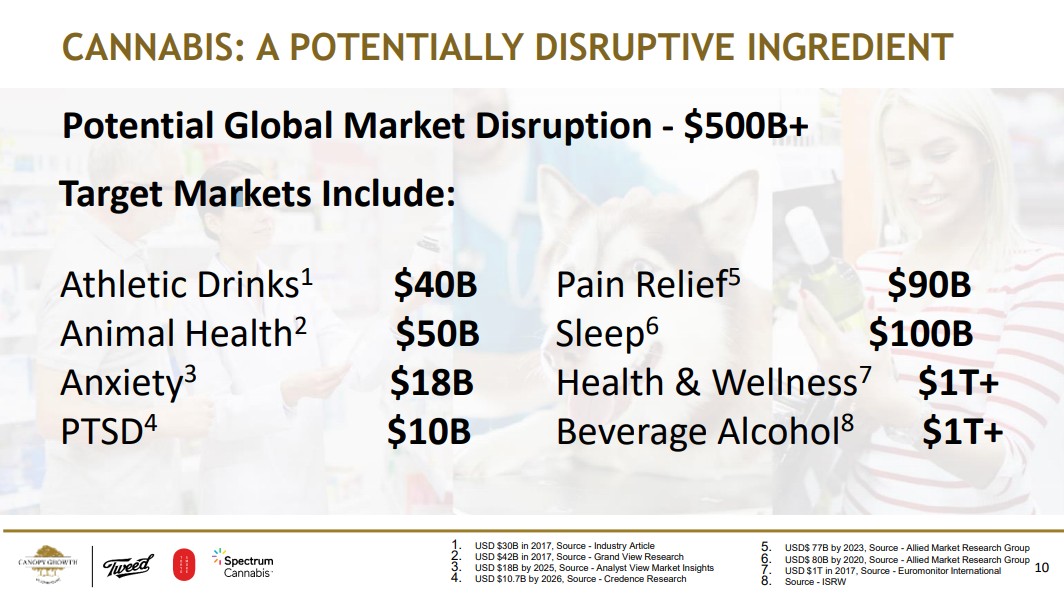 CANOPY GROWTH根據(jù)Allied Market Research Group等調(diào)研機(jī)構(gòu)按照不同用途做了一組測(cè)算,未來(lái)該行業(yè)的將會(huì)滲透全球至少5000億美元的市場(chǎng):