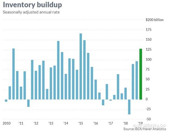 美國官方表示,1季度的增長超出了預期,部分原因是強勁的庫存增長。根據(jù)政府的數(shù)據(jù),本季度新增商品庫存320億美元,折合年率為1280億美元,推動了GDP增長約70個基點。