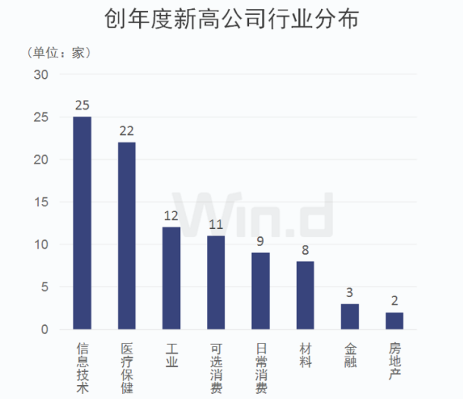 Wind統(tǒng)計(jì)顯示,有92家公司近3日最高股價(jià)創(chuàng)今年以來新高。從相關(guān)公司行業(yè)分布來看,信息技術(shù)類最多,有25家;醫(yī)療保健行業(yè)緊隨其后,有22家,工業(yè)、可選消費(fèi)均有超過10家公司??梢姡萍己蜕镝t(yī)藥類公司成為牛股聚集地。