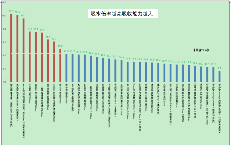 測(cè)試結(jié)果顯示,35款衛(wèi)生巾樣品吸水倍率最高達(dá)到51.2倍(櫻戀綿柔日用衛(wèi)生巾,日本原裝),最低為8.5倍(護(hù)舒寶always超薄護(hù)翼超長(zhǎng),加拿大原裝)。對(duì)于需要解決經(jīng)期量多量大問題的女性消費(fèi)者可以優(yōu)先選擇吸水倍率高的衛(wèi)生巾商品。無論選擇哪種吸量衛(wèi)生巾,婦幼保健醫(yī)生建議,衛(wèi)生巾最佳更換時(shí)間為2-3小時(shí)。測(cè)試結(jié)果詳見下圖。