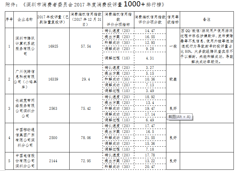 附件:《深圳市消費(fèi)者委員會2017年度消費(fèi)投訴量1000+排行榜》