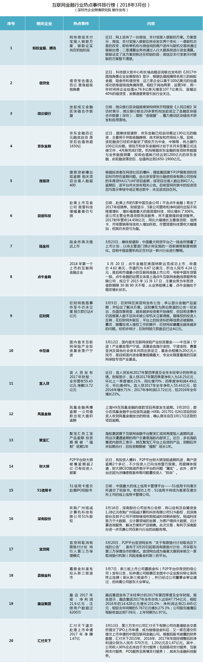 互聯(lián)網(wǎng)金融行業(yè)熱點事件排行榜榜單說明:本榜單主要通過計算機系統(tǒng)對輿情數(shù)據(jù)的自動采集、整理和分析,結(jié)合輿情分析師的篩選和研判,對2018年3月1日至3月31日這一時段內(nèi)互聯(lián)網(wǎng)金融領(lǐng)域的熱點輿情事件(主要是涉企輿情)作出綜合評估而得。主要評估指標包含新聞報道指數(shù)、微博擴散指數(shù)、論壇參與指數(shù)和境外炒作指數(shù),在上述指標基礎(chǔ)上,根據(jù)相關(guān)算法得出事件綜合影響力指數(shù),按照指數(shù)大小進行排序。
