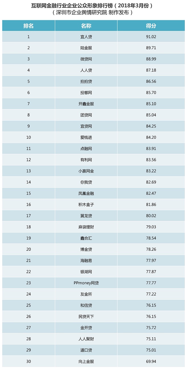 互聯(lián)網(wǎng)金融行業(yè)企業(yè)公眾形象排行榜:本榜單根據(jù)公開可查的信息、數(shù)據(jù),從規(guī)模實力、合規(guī)性、交易金額、信披透明度、輿論曝光度和負面影響等六個維度,對2018年3月1日至3月31日這一時段內(nèi)互聯(lián)網(wǎng)金融行業(yè)各企業(yè)的公眾形象進行綜合評估并排名,旨在對互聯(lián)網(wǎng)金融行業(yè)各企業(yè)開展品牌形象塑造、宣傳推廣策略、公共關(guān)系維護、品牌影響力等方面的綜合評價,既幫助相關(guān)企業(yè)找準合適的品牌定位、發(fā)展方向,也為消費者和投資者提供科學、公正、獨立的消費和投資決策參考。