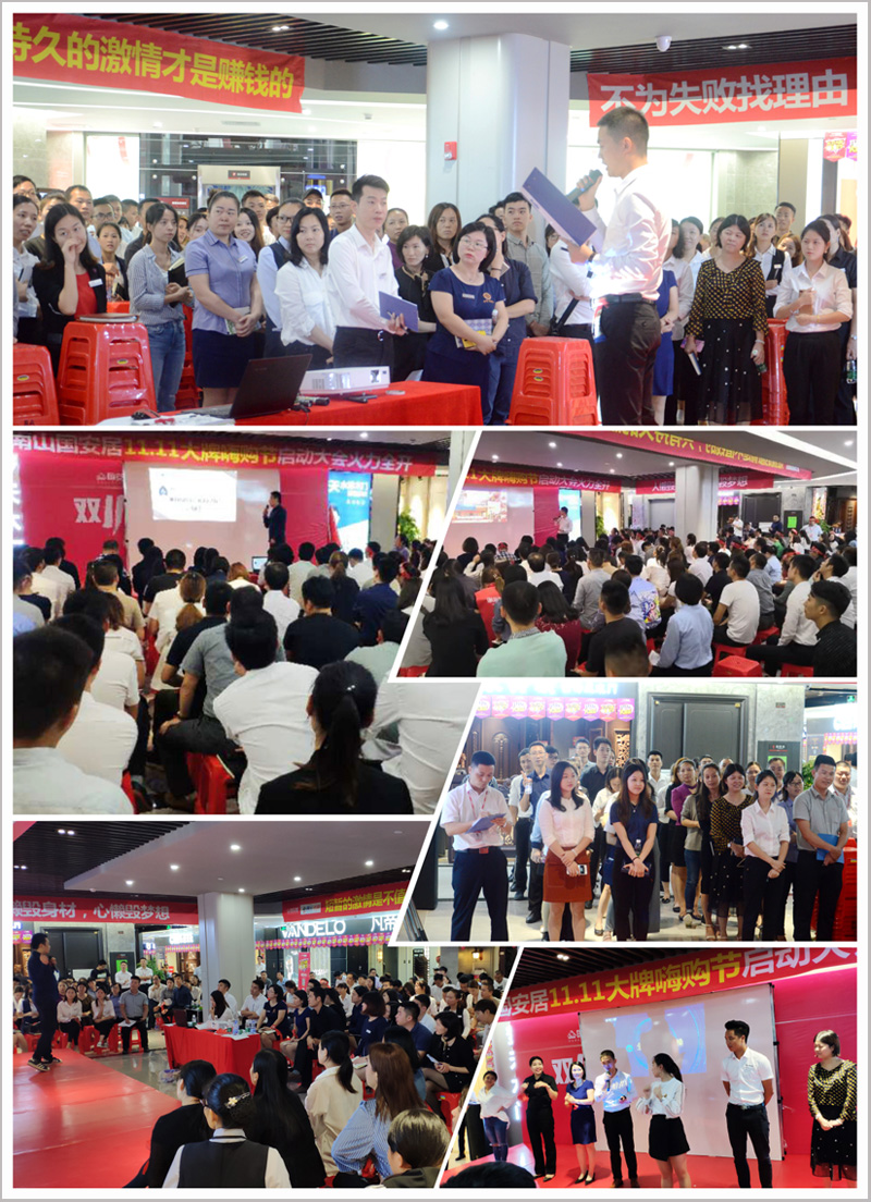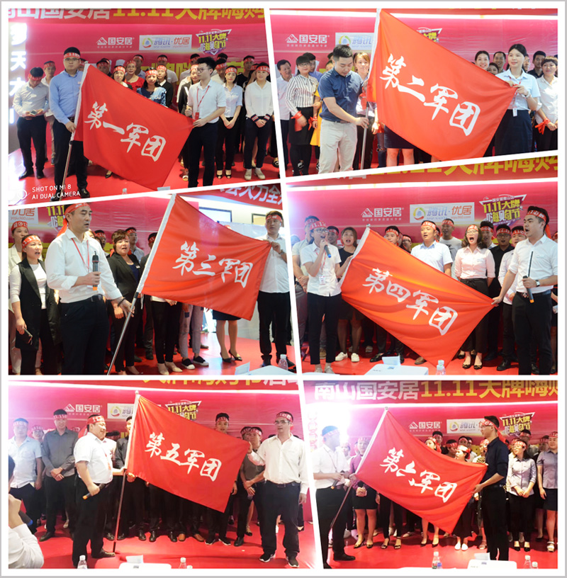 隨后,來自南山店全體方陣隊員高舉隊旗,高喊口號,將現(xiàn)場氣氛推向高潮,品牌代表們紛紛上臺發(fā)言,幾百家建材家具品牌以第一軍團、第二軍團、第三軍團、第四軍團、等等團隊方陣,登場亮相,高呼團隊口號,并且當場簽署了“雙11大促”的軍令狀,并從商場負責人手中接過了“雙11大促”的軍旗,這將預(yù)示著“國安居南山店&騰訊優(yōu)居雙11大牌嗨購節(jié)”定將以卓越的佳績,創(chuàng)造新一輪的銷售盛況!