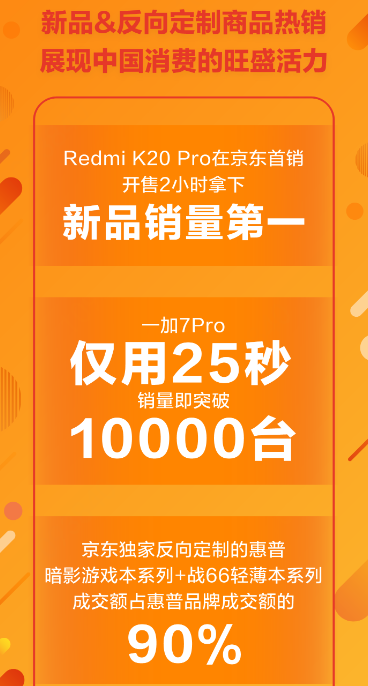 Redmi K20 Pro特地選擇在京東618期間首銷,其中還針對京東的用戶推出了京東獨家版本,而Redmi K20 Pro的整體銷售成績也表現不俗,在開售2小時就拿下新品銷量第一;而在京東618期間推出的一加7Pro,僅用了25秒就銷售上萬部。