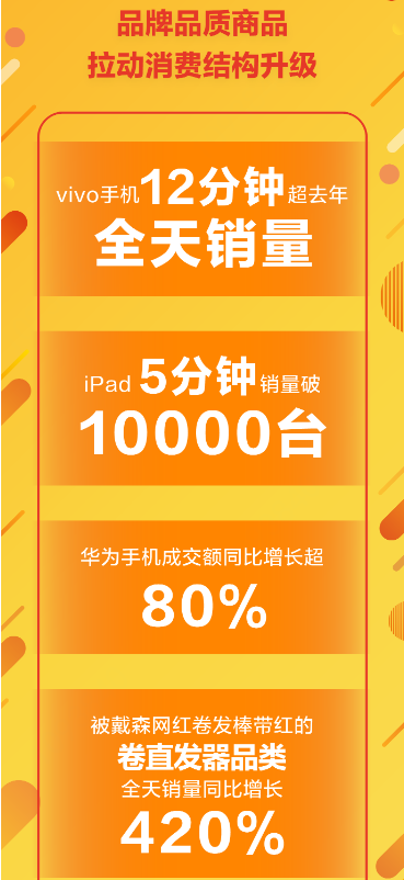 作為傳統(tǒng)優(yōu)勢品類,手機在今年618年中購物節(jié)首日的表現仍舊搶眼。vivo手機12分鐘超去年全天銷量,最終全天的銷量達到去年同期的11倍;華為手機成交額同比增長超80%,華為手機配件成交額同比增長超300%; iPad在5分鐘的銷量就突破萬臺。