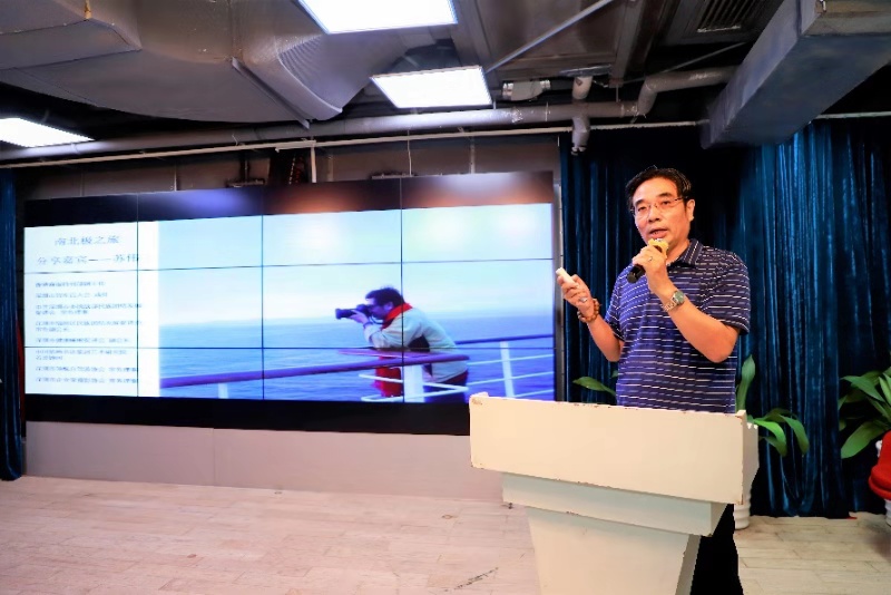 蘇偉老師在現(xiàn)場介紹:10月15日對深圳來說是一個極其不平凡的日子,上午在深圳舉辦了首屆“中國海洋第一展”暨“2019中國海洋經(jīng)濟(jì)博覽會”在深圳會展中心隆重開幕,下午由中國自主建造的首艘極地科學(xué)考察破冰船“雪龍2”號在蛇口港出發(fā)首航挺進(jìn)南極,特別機(jī)緣巧合的是我今晚分享的內(nèi)容就是南北極旅游。為什么用“畫”極地,而不是“話”極地,這是因為,地球有三極,除了南北極外,還有“珠峰”就是第三極。而我們?nèi)齻€六十年的老男人,在蘇偉老師的鼓動下,三個人用不到三年的時間,踏訪了這“三極”。如果要展開講,恐怕三天三夜也講不完。所以,“畫”極地,就是用照片,講一下照片背后的故事。