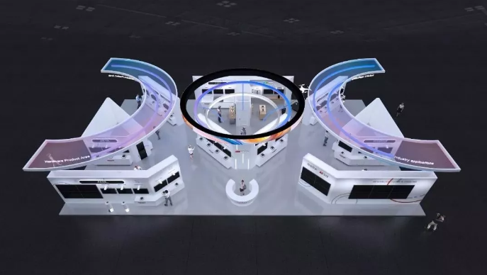 展臺的吊頂設(shè)計以“COC”形狀為主體,引發(fā)讀者眾多猜想,包括“CloudOFCity城市之云”、“AICloud三級架構(gòu)”、“物信融合”、“CalculateOnCloud”等。