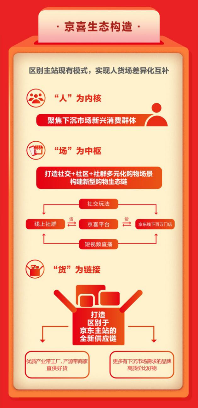 今年,京東打造了區(qū)別于京東主站現(xiàn)有場景和模式的全新平臺——京喜,于9月19日正式上線。京喜聚焦于下沉新興市場消費(fèi)人群,通過高質(zhì)價比好貨及豐富的社交玩法,與京東主站實(shí)現(xiàn)了“人”、“貨”、“場”的差異化互補(bǔ)。