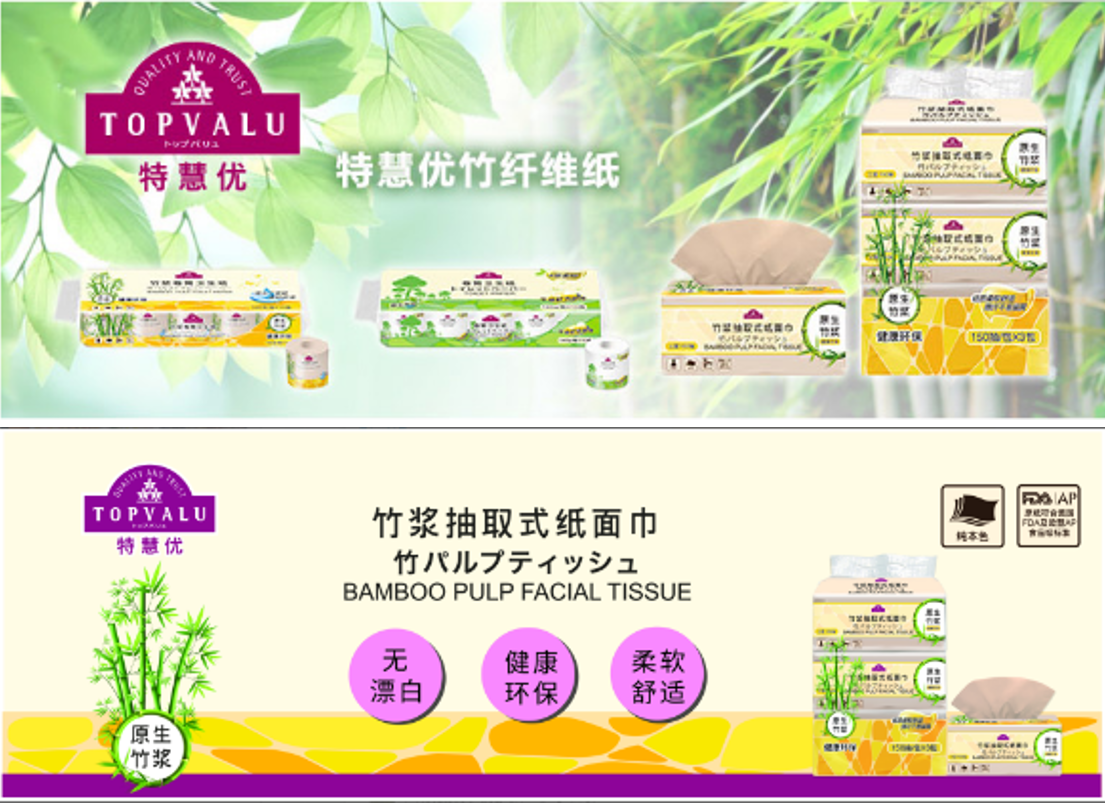 永旺始終對(duì)環(huán)境保護(hù)高度關(guān)注,開發(fā)健康、環(huán)保的、讓顧客放心使用的商品一直是永旺的目標(biāo)。正是出于這樣的考量,永旺自有品牌TOPVALU(特慧優(yōu))推出了竹漿抽取式紙面巾等系列的環(huán)境友好型商品。由于該商品做到了對(duì)環(huán)境無污染,對(duì)人體無危害,還獲得了“2018年中國零售自有品牌評(píng)選”的“綠色產(chǎn)品獎(jiǎng)”。