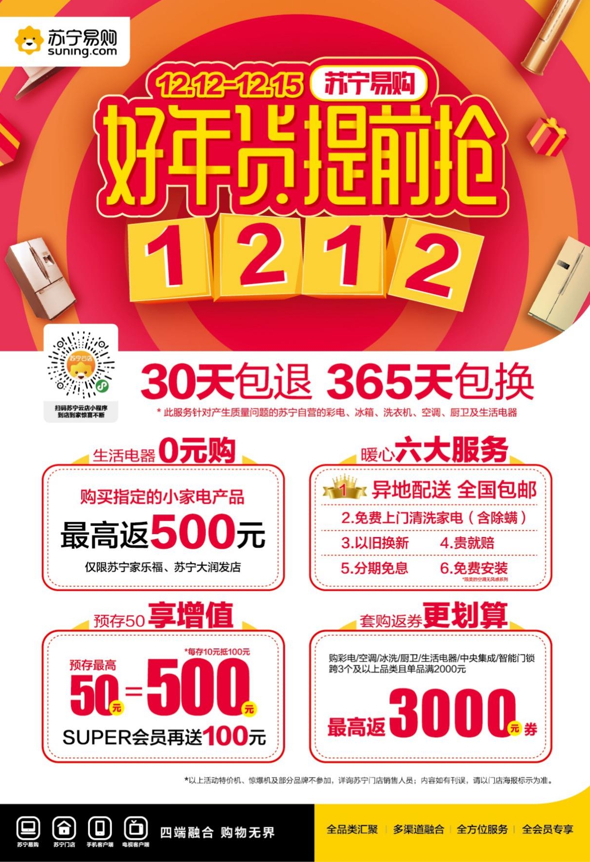 深圳新聞網(wǎng)2019年12月11日訊 2019年進(jìn)入到了最后一個(gè)月,每年的年末不論商家還是個(gè)人都處于忙碌的狀態(tài),加之2020年的春節(jié)即將到來(lái),采買年貨也被大家提上了日程。相較于吃喝來(lái)說(shuō),家電、家裝的換新更能為春節(jié)增添“新年新氣象”的氛圍,因此12月12日至12月15日深圳蘇寧開(kāi)啟雙十二好年貨提前搶,為廣大深圳消費(fèi)者帶來(lái)一場(chǎng)超級(jí)年貨搶購(gòu)盛宴。