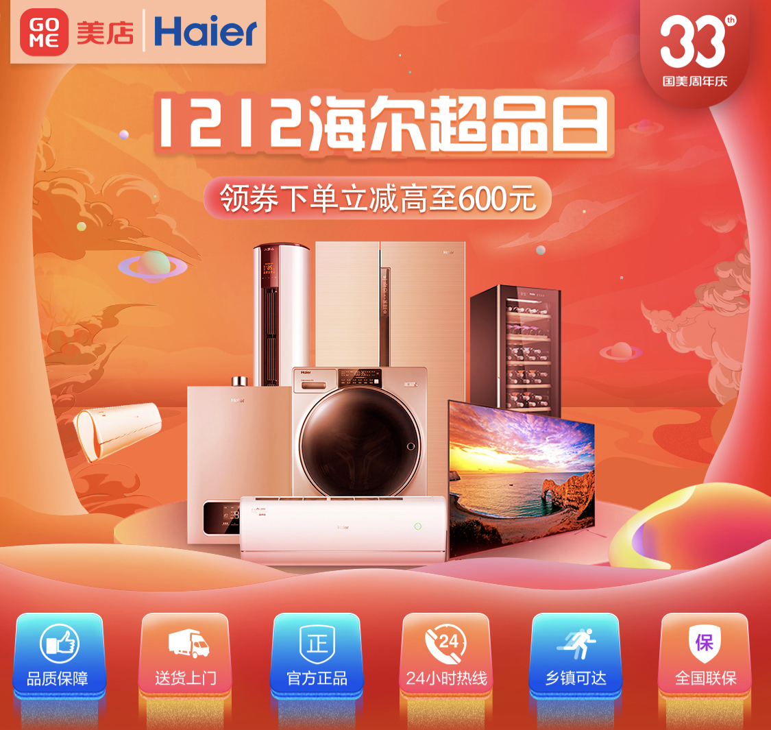 12月12日-15日,33周年生日之際,國美與海爾再度攜手,國美美店帶來海爾超級(jí)品牌日活動(dòng),涵蓋了海爾冰箱、洗衣機(jī)、空調(diào)、電視、廚房衛(wèi)浴等多個(gè)品類豐富產(chǎn)品,多重優(yōu)惠福利、六大承諾保障、延保清洗服務(wù)。