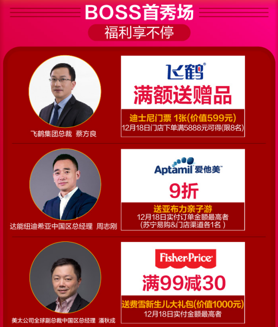 12月18日,蘇寧紅孩子打造了線上線下雙線齊發(fā)的“年終狂歡搶購盛典”。母嬰品牌大佬帶頭發(fā)福利,飛鶴集團(tuán)總裁蔡方良、達(dá)能紐迪希亞中國區(qū)總經(jīng)理周志剛、美太公司全球副總裁中國區(qū)總經(jīng)理潘秋成、寶潔大中華區(qū)幫寶適副總裁任遠(yuǎn),金佰利大中華區(qū)董事總經(jīng)理Mike等豪送價(jià)值十萬大禮?;顒?dòng)當(dāng)天,購相應(yīng)品牌產(chǎn)品且實(shí)付金額最高者就能將戴森吹風(fēng)機(jī)、老鳳祥黃金、迪士尼門票等大禮免費(fèi)帶回家。