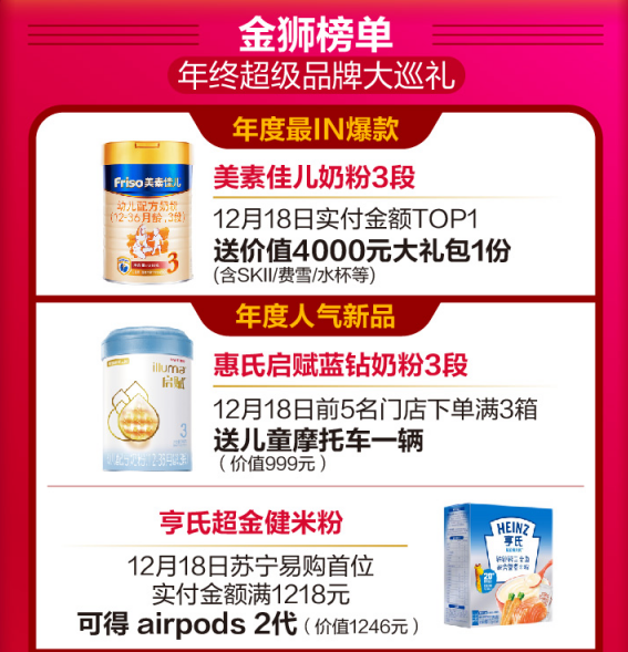 蘇寧紅孩子金獅榜單上,年度最I(lǐng)N爆款、人氣新品、超級(jí)品牌大巡禮,全是親子家庭想要的。寶媽寶爸購美素佳兒奶粉3段且實(shí)付金額TOP1的用戶將免費(fèi)獲得價(jià)值4000元大禮包一份;單會(huì)員ID購買惠氏藍(lán)鉆系列奶粉實(shí)付金額最高且滿3999元,就送祖馬瓏圣誕限量香氛禮盒一套;購買飛鶴奶粉首位且實(shí)付金額滿8888元的消費(fèi)者將獲得華為NOVA5G一個(gè)。此外,亨氏、樂可愛、費(fèi)雪、小豬班納、好奇等母嬰品牌都有超值驚喜和好禮相送。