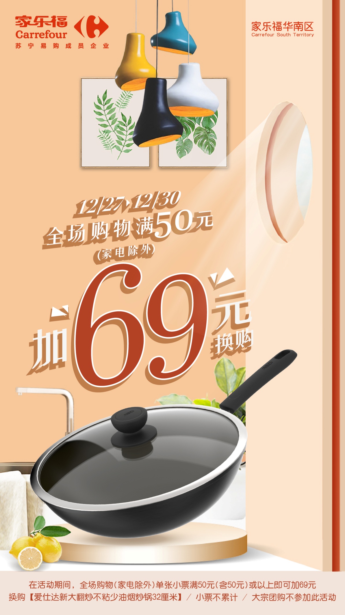 最后播報一則“筍盤”信息。12月27日至30日,顧客在家樂福華南區(qū)門店全場購物滿50元,還可加69元換購愛仕達(dá)新大翻炒不粘少油煙炒鍋32厘米(家電、大宗團(tuán)購除外,小票不累計)。