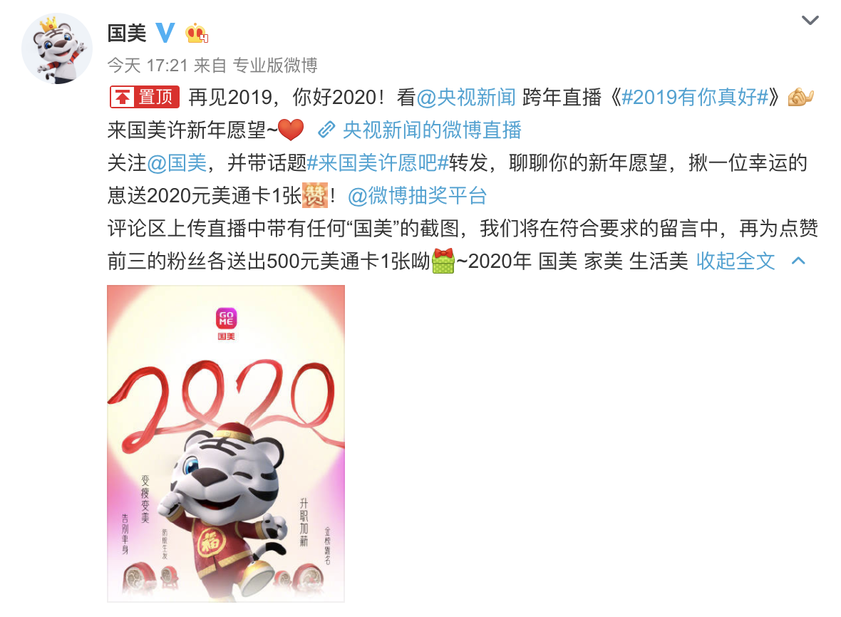 據(jù)了解,本次央視新聞跨年直播中,國美為廣大網(wǎng)友提供了多份大獎,除了零點(diǎn)的國美“全屋大換新”大獎外,還在國美心愿時間互動環(huán)節(jié)提供了60張面值1000元的國美美通卡、在扶貧禮盒環(huán)節(jié)中提供了50張面值2020元的國美美通卡。在數(shù)以千萬的用戶參與中,無論獲得哪個獎都可以稱自己為錦鯉了。