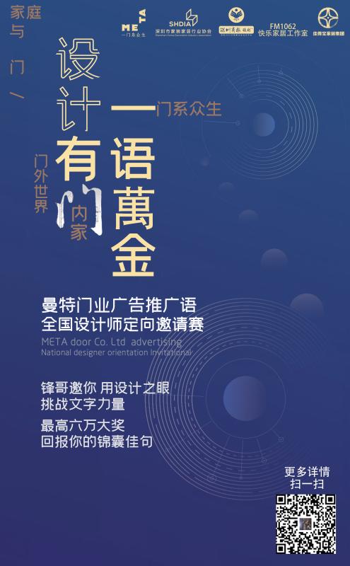 “設(shè)計(jì)有門(mén),一語(yǔ)萬(wàn)金”深圳市家裝家居行業(yè)協(xié)會(huì)、深圳商報(bào)、FM106.2《快樂(lè)家居》工作室聯(lián)手曼特門(mén)業(yè)舉辦的曼特門(mén)業(yè)廣告推廣語(yǔ)全國(guó)設(shè)計(jì)師定向邀請(qǐng)賽,在2020年1月1日正式啟動(dòng)啦。