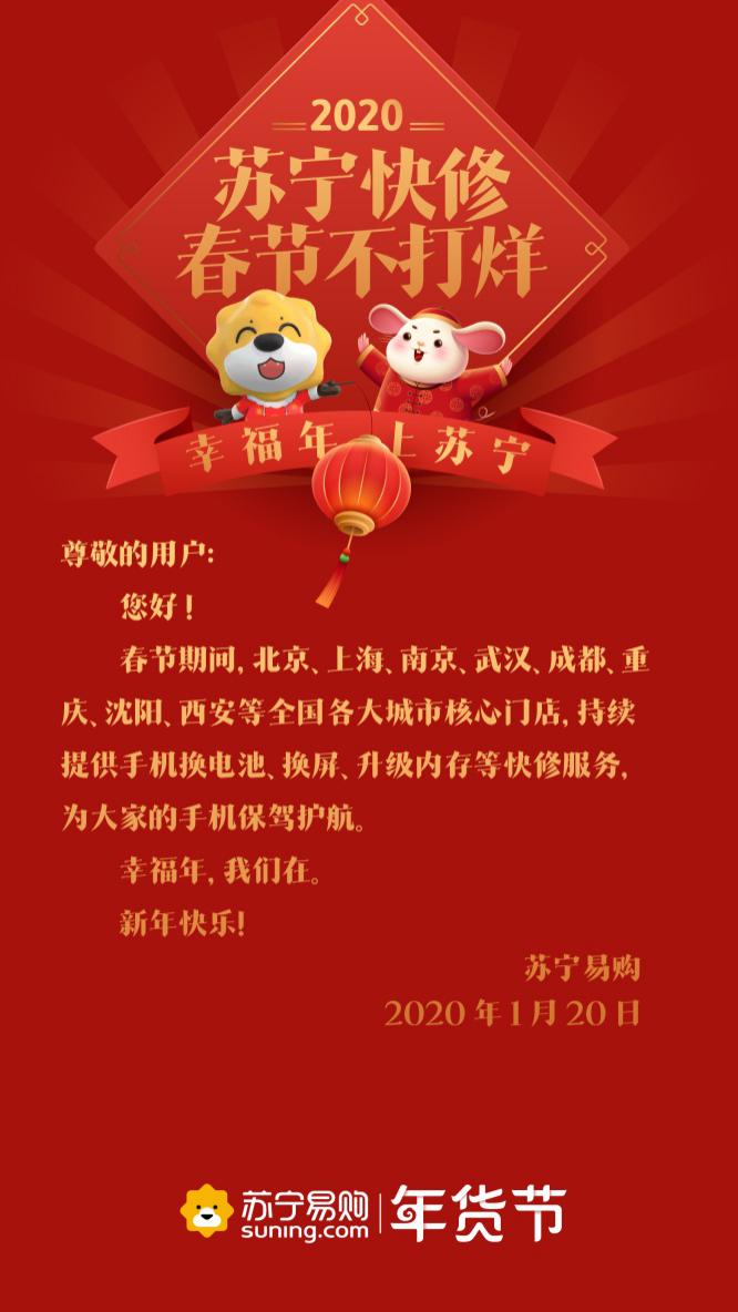 家電3C方面,春節(jié)期間,蘇寧電器店正常營(yíng)業(yè),門(mén)店配送、安裝、售后服務(wù)等正常進(jìn)行。蘇寧舊機(jī)回收服務(wù)持續(xù)覆蓋250個(gè)城市,北京、上海、南京、廣州、深圳、成都、武漢、沈陽(yáng)、重慶、西安城區(qū)48小時(shí)上門(mén),縣鎮(zhèn)區(qū)域72小時(shí)上門(mén)。