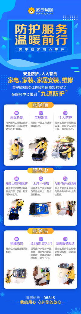 據(jù)悉,蘇寧家電“九道防護(hù)”措施涵蓋服務(wù)的前、中、后期全程。服務(wù)前,蘇寧服務(wù)工程師需進(jìn)行體溫檢測,衣物工具車輛消毒,同時(shí)佩戴口罩;服務(wù)過程中,需佩戴口罩、手套、鞋套等全套防護(hù)工具,并主動與用戶保持2米的安全距離,避免直接接觸;服務(wù)完成后,對機(jī)器進(jìn)行清潔處理,同時(shí)指導(dǎo)用戶關(guān)注報(bào)修和故障求助,帶走作業(yè)垃圾。