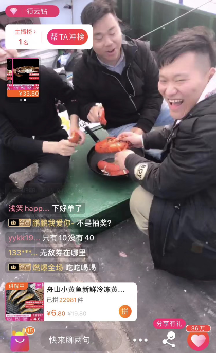一旁直播的尹鴻狀態(tài)正好,從剛開播到現(xiàn)在,直播間的人數(shù)嗖嗖往上竄,不一會便聚集了十幾萬圍觀群眾。搖晃的直播鏡頭,更具真實感,似乎把觀眾帶到了船上一般。尹鴻馬不停蹄在船上踱步,給觀眾介紹各種海鮮小知識,并大力吆喝起這次直播主打的兩款產(chǎn)品:深海小黃魚和舟山帶魚。“我們蘇寧拼購的海產(chǎn)品都是從張老大這樣漁民手中收來的,下單直發(fā),眼見為實?!?/p>