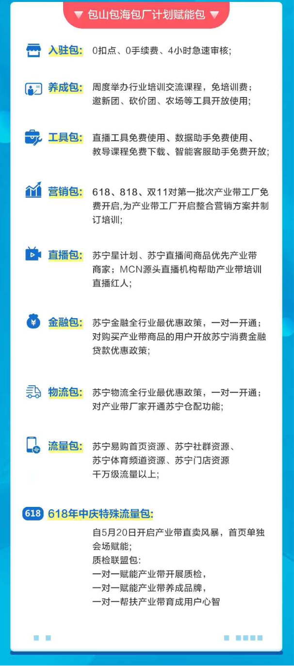 為了扶助產業(yè)帶商戶快速成長,蘇寧拼購發(fā)布了“包山包海包廠”賦能包,從物流、金融、營銷、直播、工具等多個角度扶助產業(yè)帶商戶。