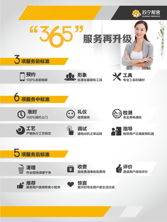 “三分產(chǎn)品七分安裝”,超60萬套空調(diào),如何保障快速及時的安裝?蘇寧幫客負(fù)責(zé)人告訴記者,蘇寧全國區(qū)域空調(diào)售后服務(wù)堅持貨到24小時上門安裝的服務(wù)時效,并按照用戶預(yù)約時間準(zhǔn)時上門。不僅如此,全國蘇寧幫客空調(diào)安裝服務(wù)統(tǒng)一堅持365服務(wù)標(biāo)準(zhǔn),覆蓋作業(yè)前、中、后期的工服、工牌、鞋套、墊機布、收費標(biāo)準(zhǔn)、衛(wèi)生維護等多項標(biāo)準(zhǔn),并歡迎用戶監(jiān)督。