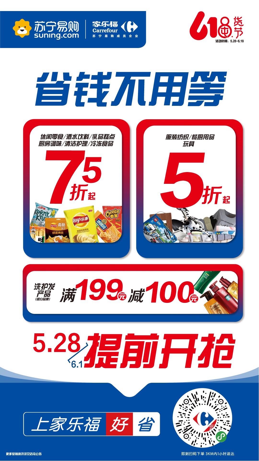 作為蘇寧陣營(yíng)中的排頭兵、蘇寧大快消產(chǎn)業(yè)的核心部分,家樂(lè)福率先出戰(zhàn)。為了給消費(fèi)者提供充足時(shí)間選擇心儀的商品,家樂(lè)福618囤貨節(jié)即將拉開(kāi)帷幕,讓消費(fèi)者盡享“618省錢(qián)不用等”的升級(jí)購(gòu)物體驗(yàn)。