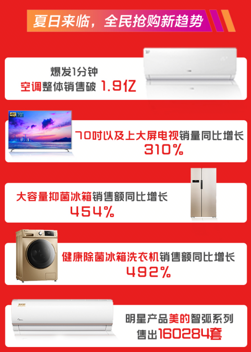 在品類表現(xiàn)上,空調(diào)、冰洗、彩電銷售火熱。爆發(fā)1分鐘,空調(diào)整體銷售破1.9億,明星產(chǎn)品美的智弧系列18小時售出160284套;截至18時,健康除菌冰箱洗衣機(jī)銷售額同比增長492%。
