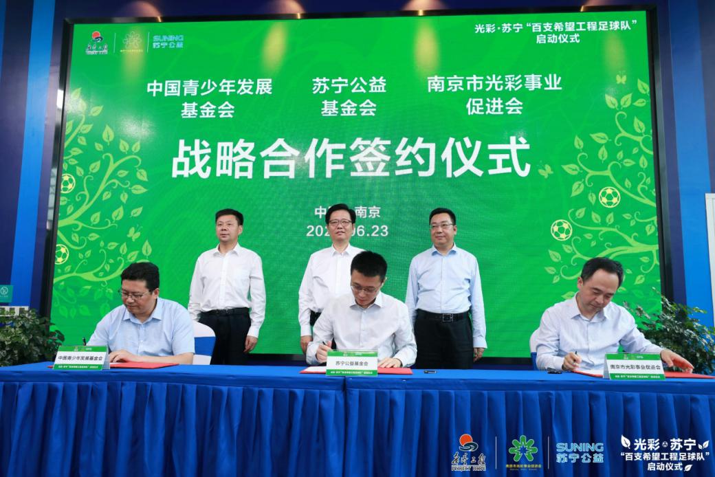 中國青少年發(fā)展基金會黨委常委、副秘書長梅峰,南京市工商聯(lián)副主席、市光彩事業(yè)促進(jìn)會副會長錢衛(wèi)冰,南京市委統(tǒng)戰(zhàn)部一級調(diào)研員、市光彩事業(yè)促進(jìn)會副會長張福東,江蘇省企業(yè)團(tuán)工委書記、省青年商會秘書長薛保剛,南京市委統(tǒng)戰(zhàn)部經(jīng)濟處處長、市光彩事業(yè)促進(jìn)會秘書長端澤明,蘇寧控股集團(tuán)黨委書記、江蘇蘇寧足球俱樂部董事長王哲,蘇寧控股集團(tuán)黨委常務(wù)副書記、蘇寧公益基金會理事長馬康等領(lǐng)導(dǎo)出席參與了啟動儀式。與此同時,江蘇蘇寧足球俱樂部的吳曦、吉翔、馬君等球星,以及受助學(xué)校師生代表,也在現(xiàn)場一同見證了公益計劃的啟動。