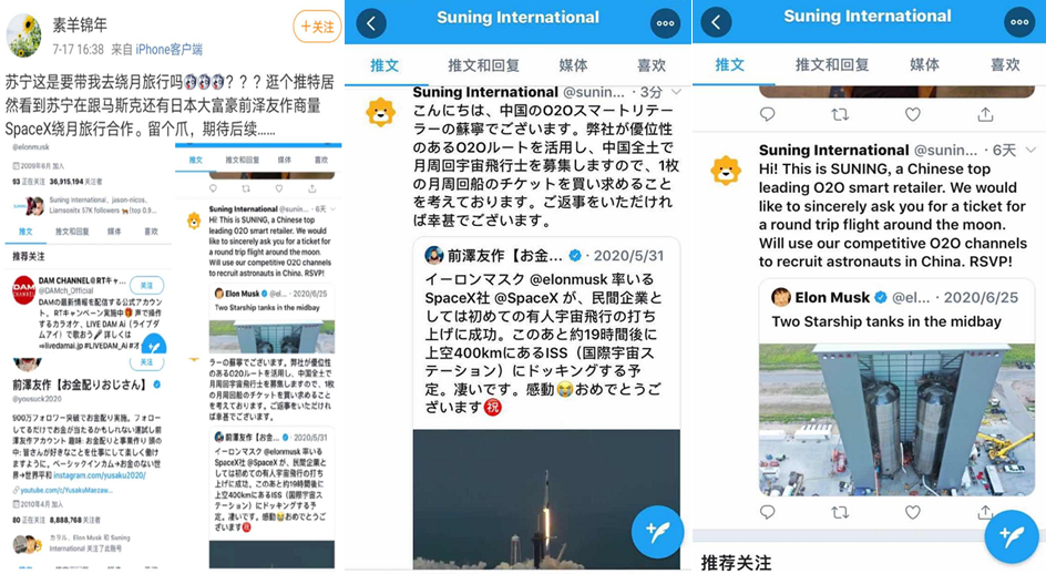 一個馬斯克,一個前澤友作,這趟萬眾矚目的繞月之旅原本跟我們國內(nèi)是沒什么關(guān)系的,但因為蘇寧的出現(xiàn)突然有了轉(zhuǎn)機(jī)。有微博用戶爆料,蘇寧7月中時候就在推特向馬斯克及前澤友作分別拋出合作求繞月旅行船票的橄欖枝。