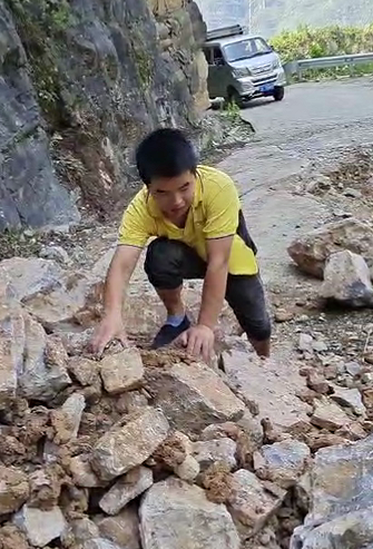 由于前期暴雨天氣,焦厚松車才開到半路,就看到前方的路有了滑坡,緊靠著崖壁的道路已經(jīng)垮了一半?!暗纛^還是前行?”焦厚松最終戰(zhàn)勝了猶豫,“答應(yīng)了用戶今天送到,不能就這樣放棄,先看看情況?!彼_始下車觀察路況,發(fā)現(xiàn)主要是碎石堵住了前方七八米的路程?!叭绻謇硪恍囕v就能開過去?!闭f干就干,焦師傅隨后就開始徒手清理路上的石塊。