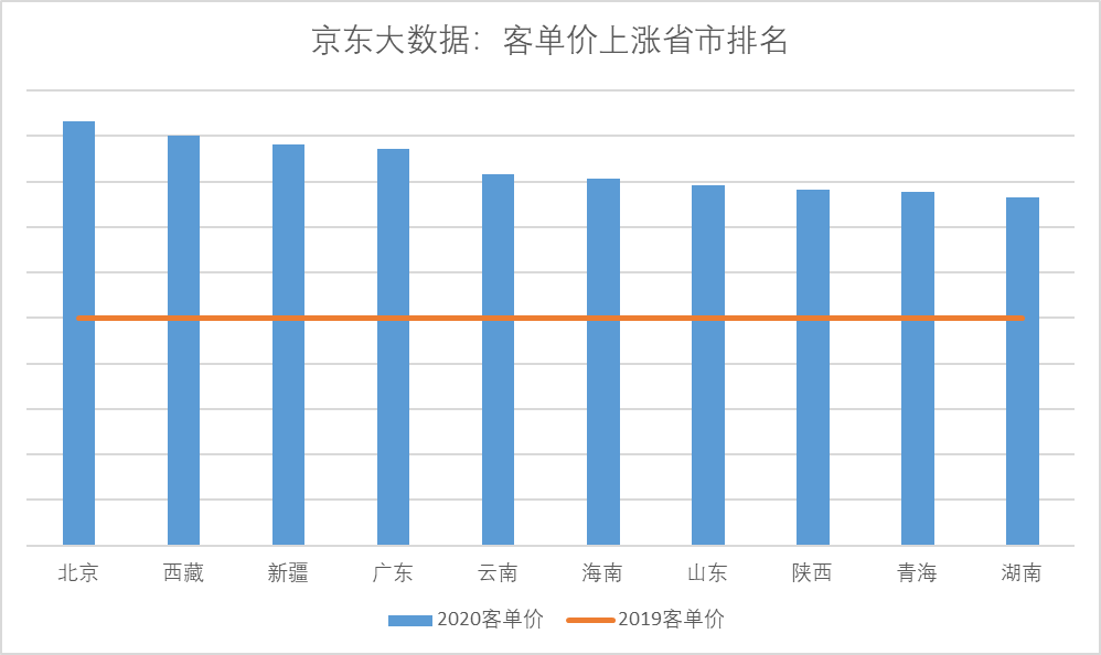 但是,消費(fèi)者采購月餅時(shí)卻呈現(xiàn)出更積極的上升趨勢:據(jù)京東大數(shù)據(jù),今年京東平臺(tái)上不但用戶數(shù)大幅增加,其中相當(dāng)大部分新用戶來自低線市場用戶,而且消費(fèi)者相比去年更加追求品質(zhì),大品牌、高規(guī)格的月餅禮盒熱銷,因此月餅平均客單價(jià)比去年上漲了35%以上。下圖可見,除北京廣東等發(fā)達(dá)地區(qū)外,客單價(jià)上漲的主要?jiǎng)恿碜杂谖鞅?、西南和華中等地區(qū)。