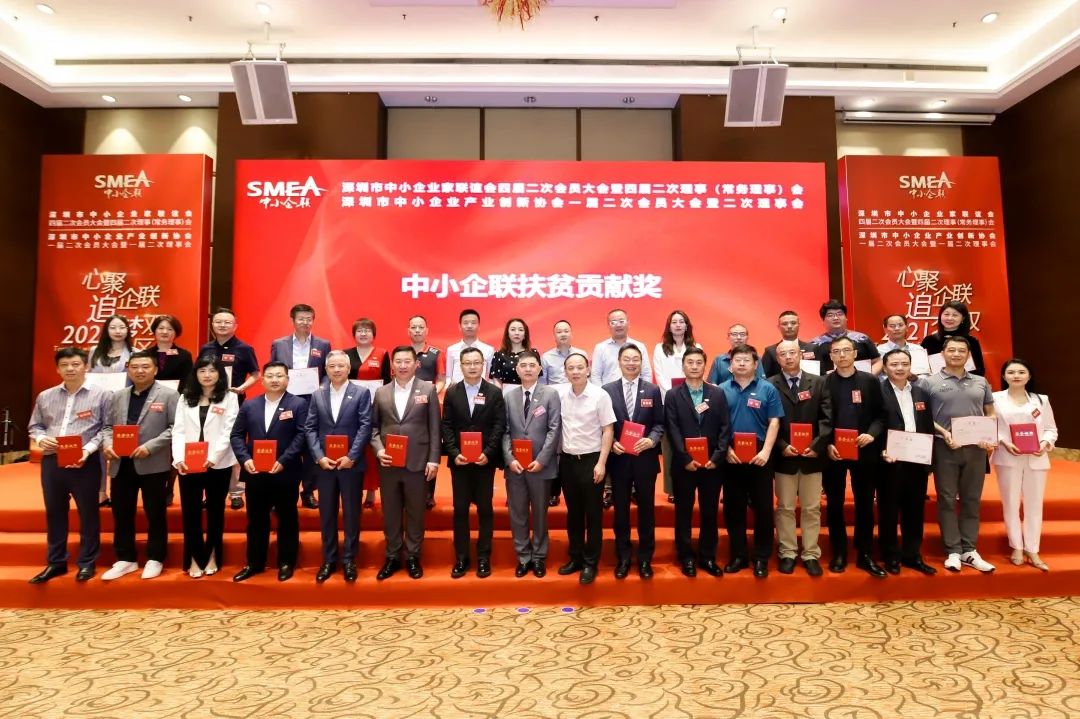 深圳市中小企業(yè)服務(wù)局副局長陳小林(左九)為獲得扶貧貢獻(xiàn)獎(jiǎng)的企業(yè)家頒獎(jiǎng)