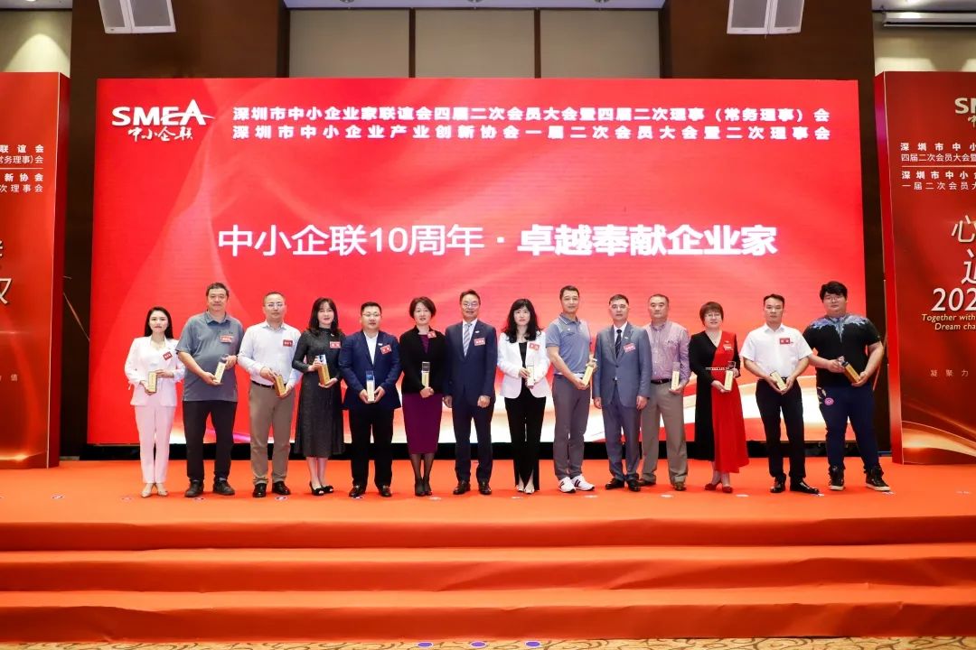深圳市中小企業(yè)服務(wù)局副局長陳小林(左七)為獲得卓越貢獻(xiàn)獎(jiǎng)的企業(yè)家頒獎(jiǎng)