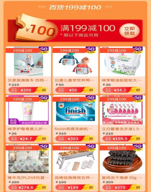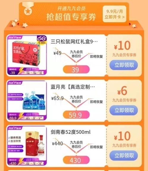 活動(dòng)期間,九九會(huì)員可搶專(zhuān)享大額券,大牌網(wǎng)紅爆品狂歡底價(jià)。三只松鼠網(wǎng)紅堅(jiān)果禮盒998g*2券后價(jià)39元,藍(lán)月亮洗衣液禮包券后價(jià)59.9元,劍南春52度500ml酒券后價(jià)430元......實(shí)實(shí)在在讓用戶買(mǎi)到“真低價(jià)”,買(mǎi)的“真值得”!