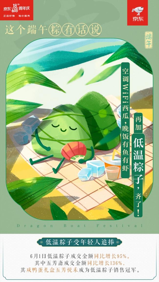 據(jù)京東生鮮的數(shù)據(jù),6月1日-6月6日低溫粽子成交金額同比增長64%、6月1日低溫粽子成交金額同比增長95%。其中五芳齋成交金額同比增長136%,其咸鴨蛋禮盒五芳悅禾成為低溫粽子銷售冠軍。